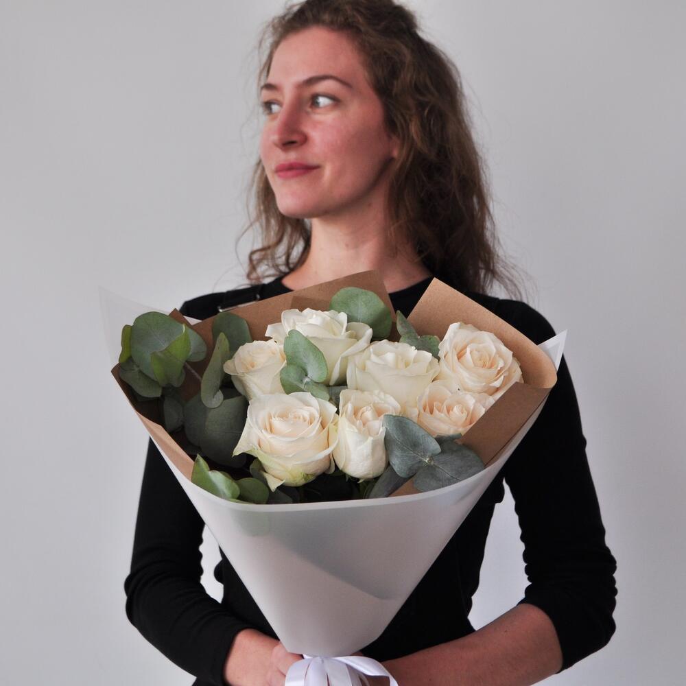 Белые розы и Эвкалипт ( 7 штук )