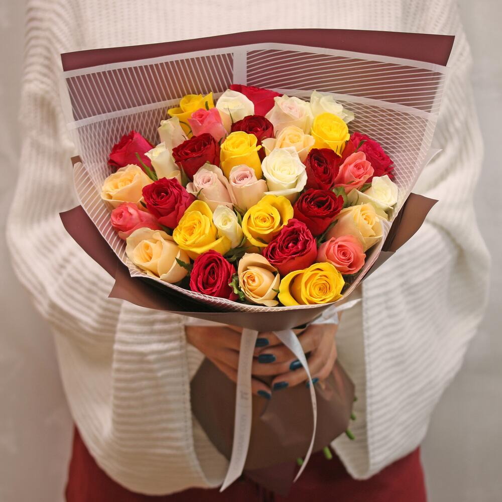Букет из 35 роз микс 35-40 см (Кения) в упаковке