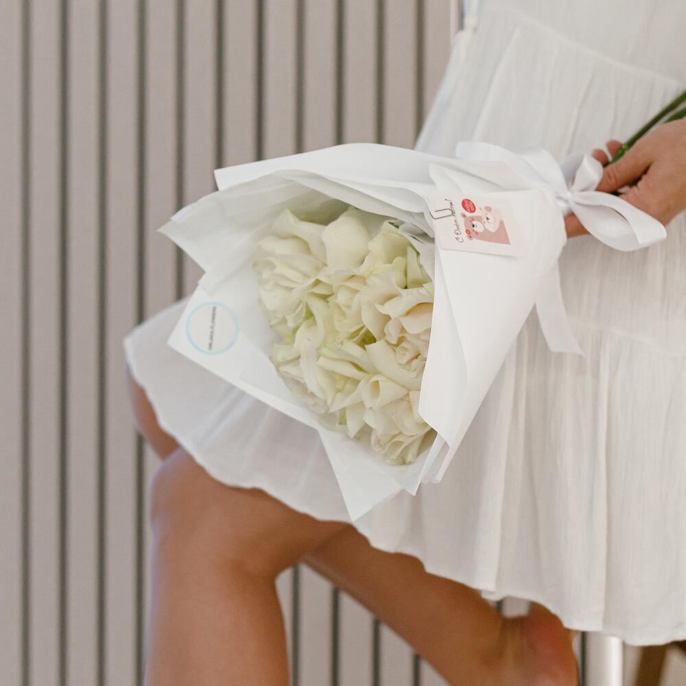 Роза французская – 5 шт.Тишью – 2 шт.Корейская пленка – 2 шт.Лента атласная – 1 шт.инструкция по уходу за цветами – 1 шт.Пакет крафтовый – 1 шт.