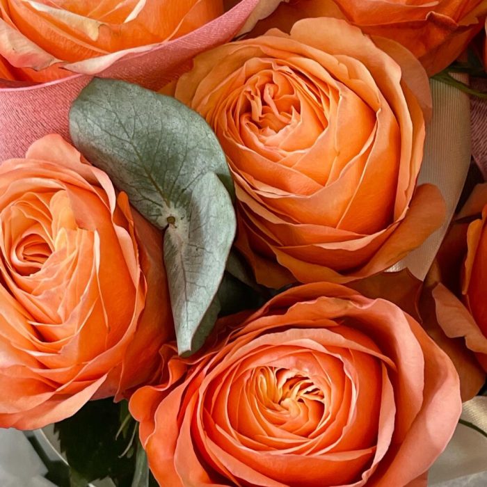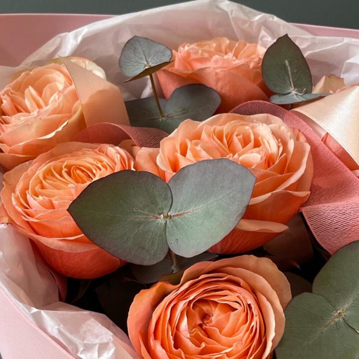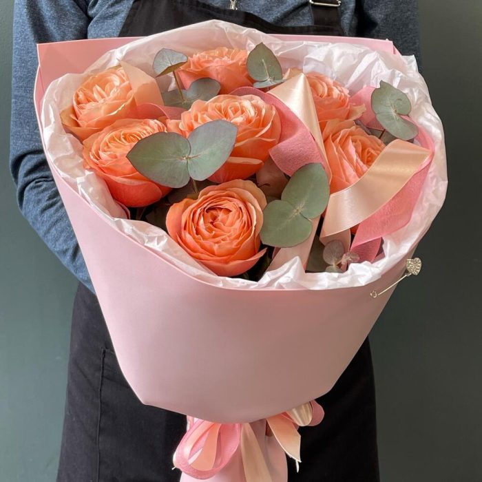 Букет из пионовидных персиковых роз и эвкалипта