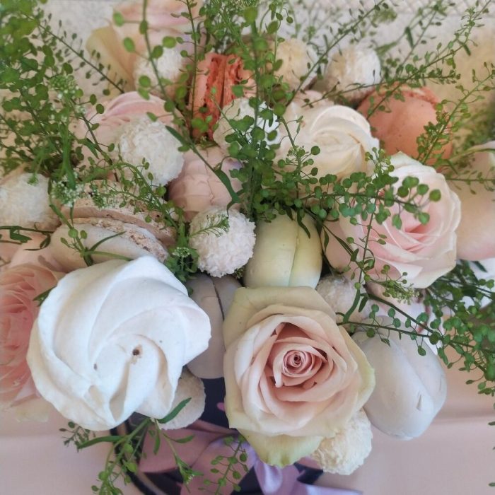 Раффаэлло – 20 шт.Упаковка дизайнерская – 1 шт.Шляпная коробка с лентами – 1 шт.Зефир ручной работы – 10 шт.Зефир ванильный – 6 шт.зелень декоративная – 10 шт.розы – 9 шт.